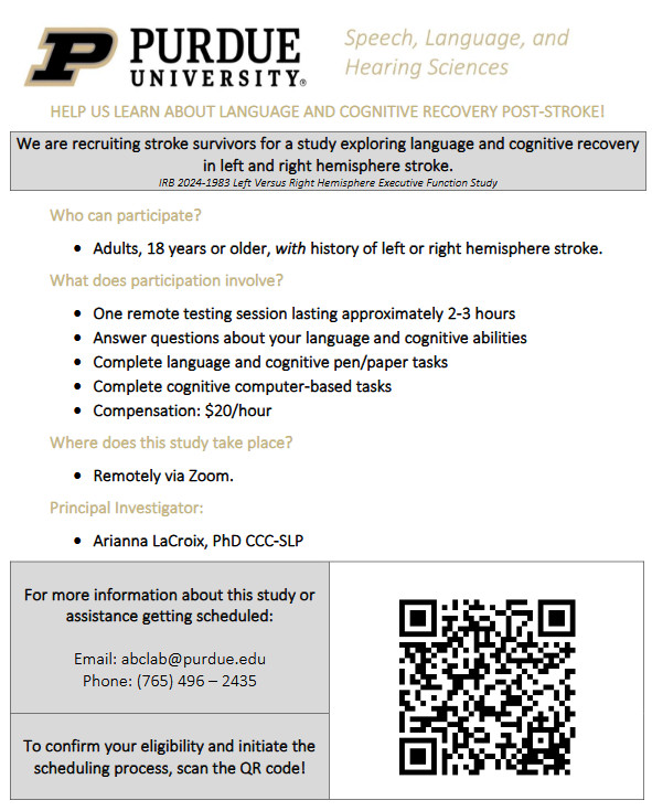 Researchers at Purdue University, Iowa are studying language and cognition recovery after stroke. They are looking for people with a right or left hemisphere stroke who spoke English from before the age of 5 years old. This study is online only, and will take 2-3 hours. If you have more questions, or are interested in participating, contact abclab@purdue.edu or call 765 496-2435.