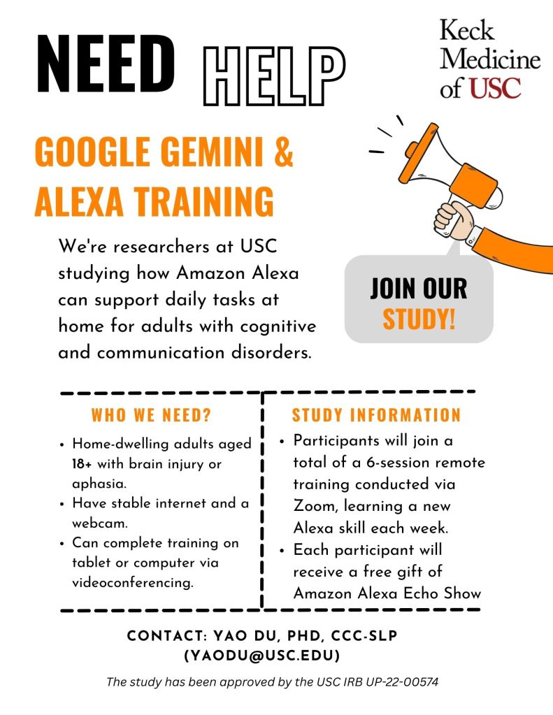Open to adults 18 year or above who have aphasia and/or a cognitive disorder. Training for six sessions on Zoom. Bilingual speakers are welcome. Contact Yao Du at yaodu@usc.edu